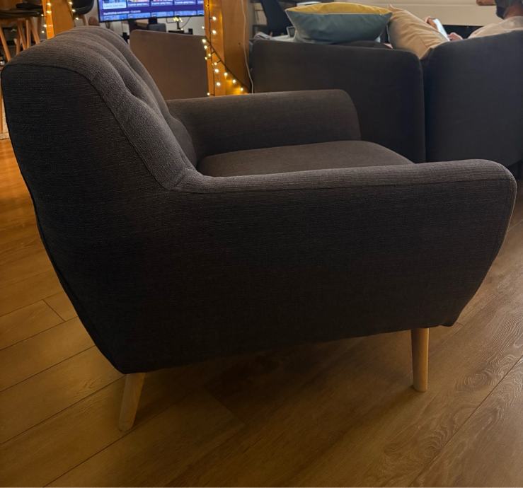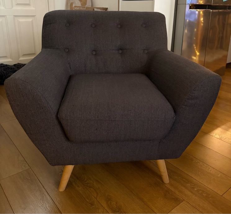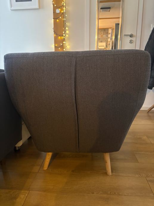 Fotelja je jako mao koristena. Cvrsta drvena konstrukcija. Drvene nogice koje su dizajnirane da budu asimetricne.