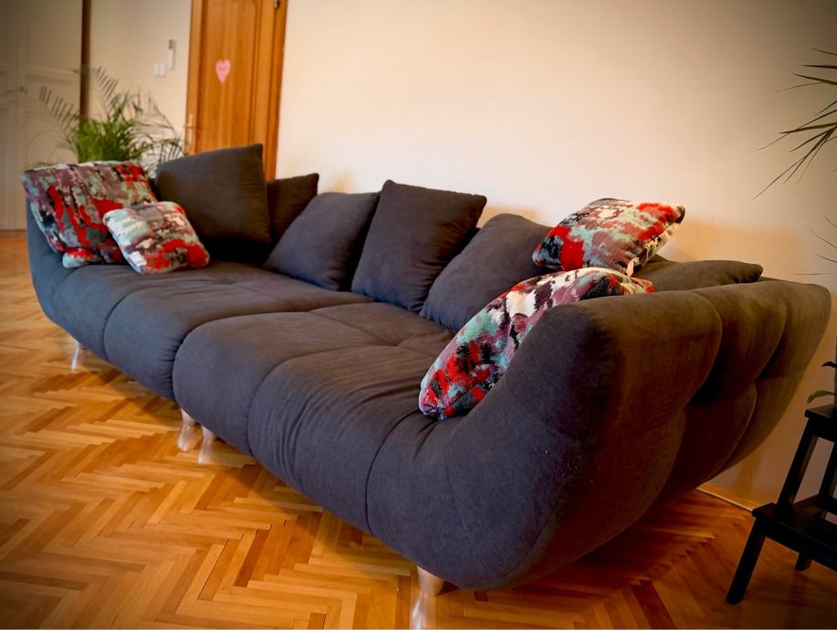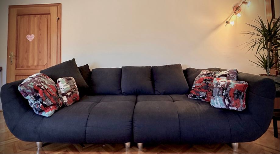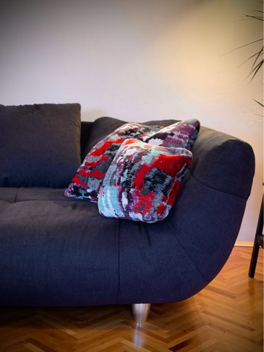 Prodajem rabljenu sjedeću garnituru Ruby soro od proizvođača Mima. Sofa ima moderna zaobljena oblika s udobnim sjedištem i naslonom, presvučena tamnom tkaninom. Dimenzije su 240x114x82 cm, što znači da je prostrana i dobro pristaje većim dnevnim boravima. Garnitura stoji na metalizitlranim nogicama. Dolazi s dekorativnim jastucima u šarenim bojama.