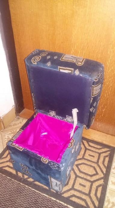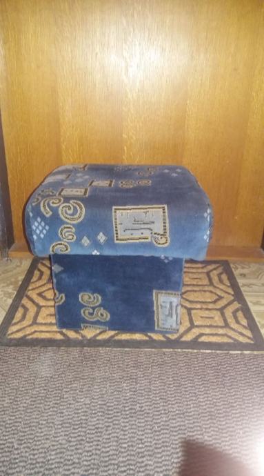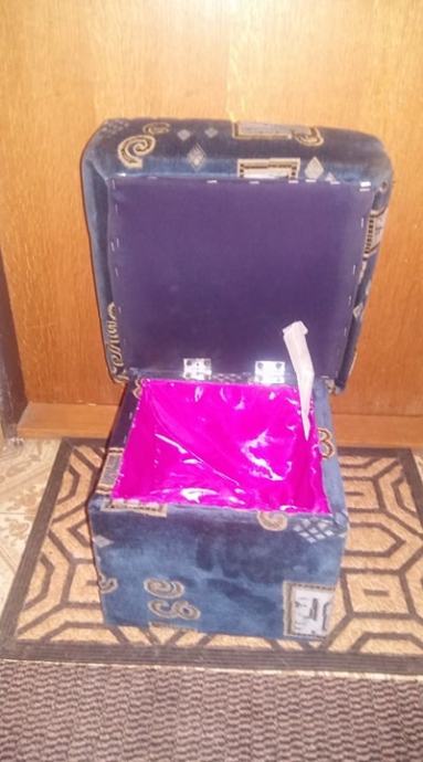 Tabure sa spremištem za sitnice. Visina 32 cm, vanjska dim sjedišta 37 x 37 cm, dim. spremišta 23 x 23 x 20 cm, vanjska dim. dna 27 x 27 cm