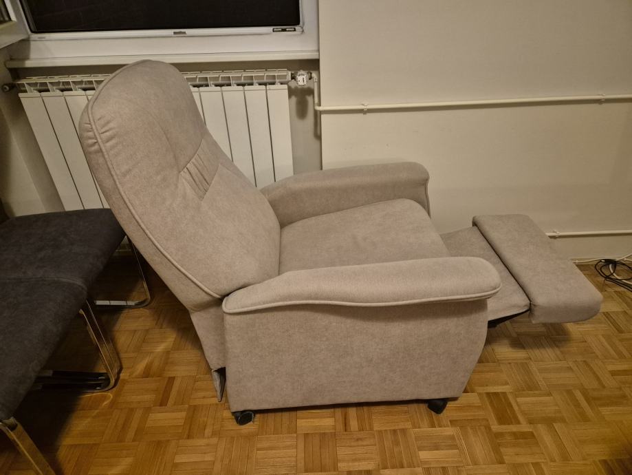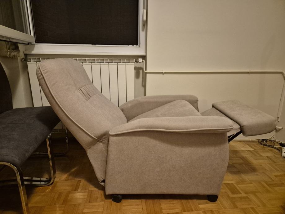 Novu i nekorištenu TV Fotelju sa mogučnošću prilagođavanja nagiba po želji korisnika i sa dodatkom za oslonac nogu prodajem iz razloga šta mijenjam stan za manjio, pa istu nemam gdje staviti. Fotelja je na kotačima i lako pokretna, a sve je vidljivo na priloženim slikama