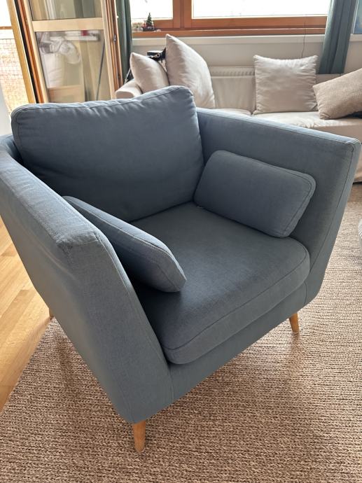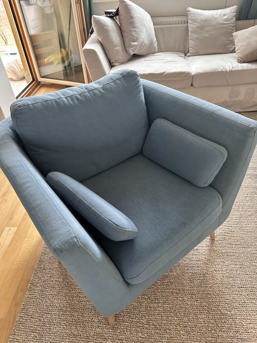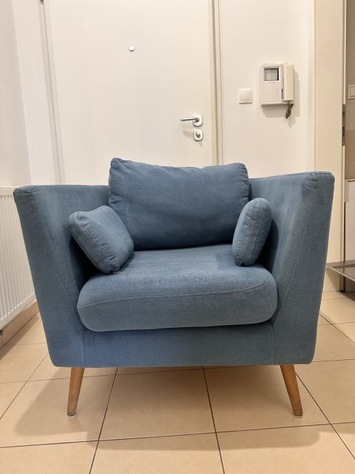 U dobrom stanju, plavo-siva tkanina, stabilna, s drvenim nogicama i dodatnim jastučićem za leđa.