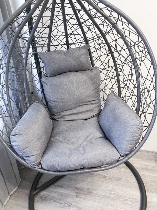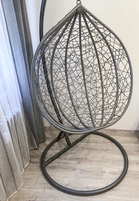 Prodajem zbog renovacije stana kvalitetnu viseću fotelju sa slike, jako malo korištenu, iz nepušačkog doma, bez kućnih ljubimca. Kupljena je pred godinu dana (za 2400 kuna) i držana u zatvorenom, tako da još uvijek miriše po novom. Fotelja ima sive jastuke koji se mogu podešavati (manji jastučić za glavu nije uopće korišten) te imaju navlake na patentni zatvarač koje se mogu skinuti i oprati. Jastuci su potpuno odvojivi od košare tako da možete staviti i vaše. Visina ljuljačke, od tla do sjedećeg dijela, lako se može podešavati na gornjem mehanizmu vješnjem na višu-nižu "ušicu" lanca (4 razine). U stalku smo dodatno integrirali gumenu zaštitu oko vijka (s unutarnje strane koja nije vidljiva) tako da se ne čuje škripanje tijekom sjedenja/ljuljanja, što je kod ovih ljuljačka obično slučaj jer se metal grebe o metal. Pogodna je za držanje na terasi ili u zatvorenom.