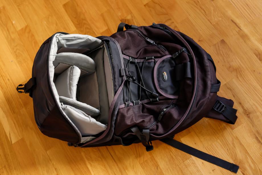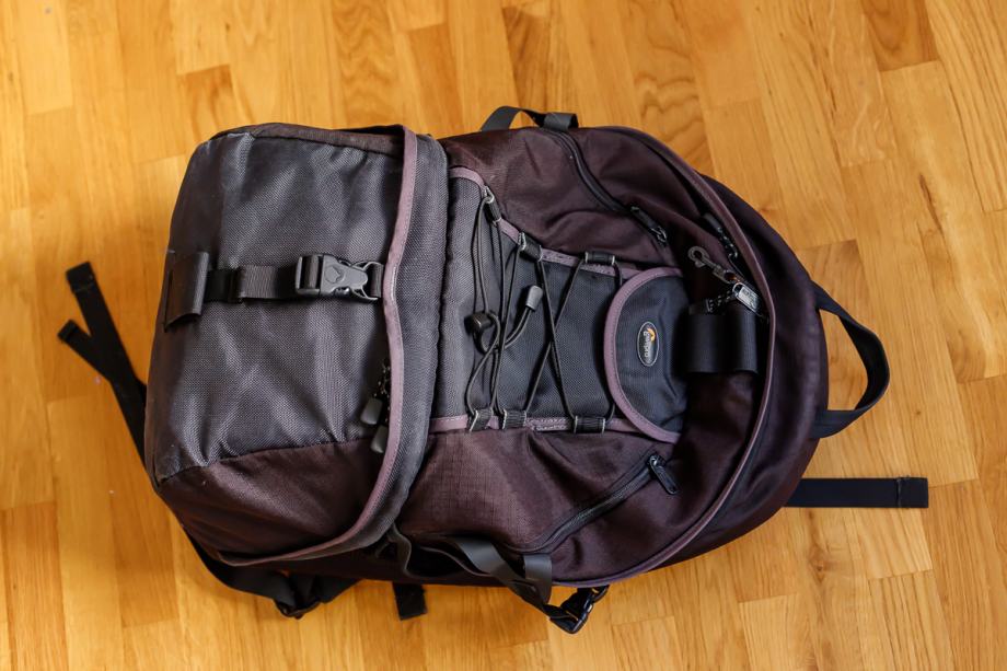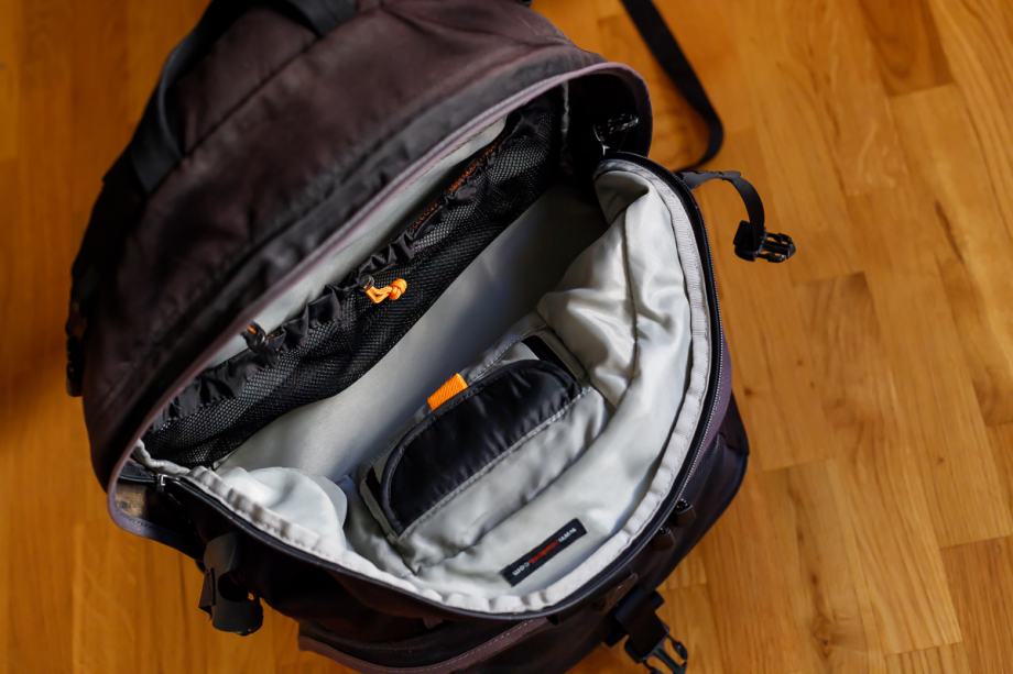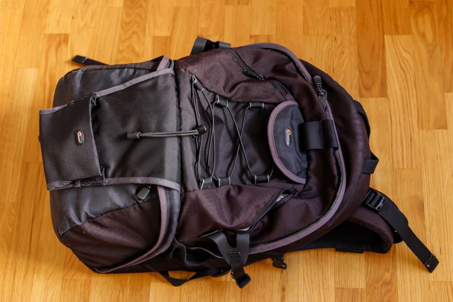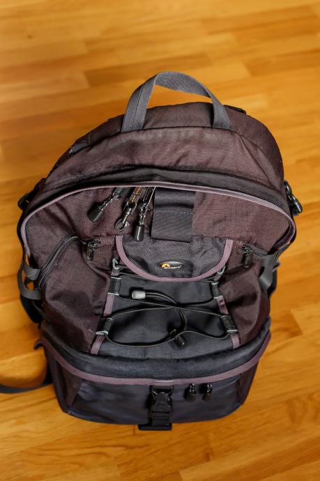 Donji dio torbe namjenjen je za foto opremu, a gornji dio za osobne stvari. Sadrži džep za laptop, niz džepova za opremu i sitnice, nastavak za nošenje stativa, te kabanicu za kišu.