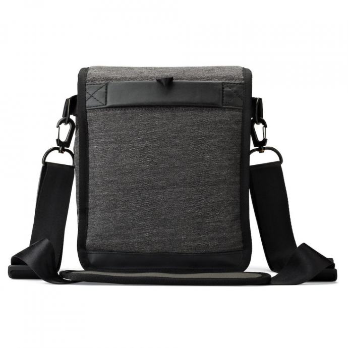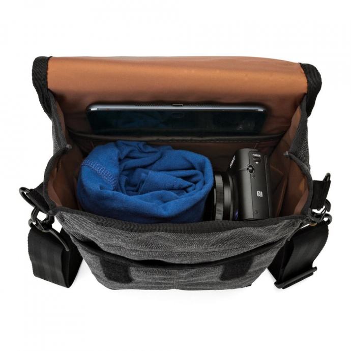 Compact & protective, urban-style shoulder bag designed to protect a tablet, personal items, and gear like a mirrorless camera.