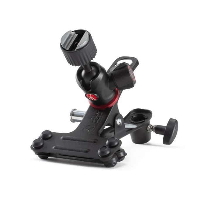 Na stezaljku je pričvršćen pouzdan Manfrotto kuglasti zglob s više položaja te potpunim mogućnostima zakretanja (pan) i nagiba (tilt). Nakon što je stezaljka učvršćena, dodatna oprema može se precizno namjestiti u željeni kut pomoću jednog jedinog gumba za zaključavanje i sigurno fiksirati. Na kuglastom zglobu nalazi se Manfrottov vrlo cijenjeni Cold Shoe nosač koji omogućuje jednostavno i sigurno pričvršćivanje dodatne opreme: odvrnite prsten, umetnite dodatak, zavrnite prsten – i sve je čvrsto na svom mjestu.
