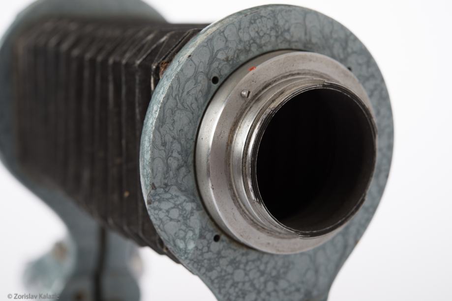 S druge strane mijeha je otvor (rupa) za objektiv i ima 4 rupice za vijke, ali mi je nepoznato kako se pričvršćuje objektiv jer nema ni navoja ni bajoneta, vjerojatno nedostaje još bajonet adapter ili adapter sa navojem za objektiv.