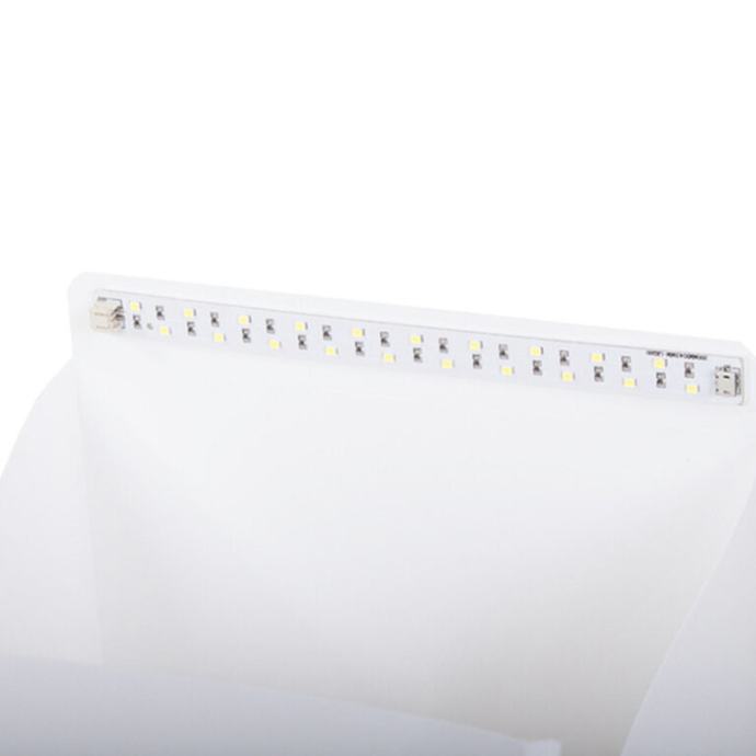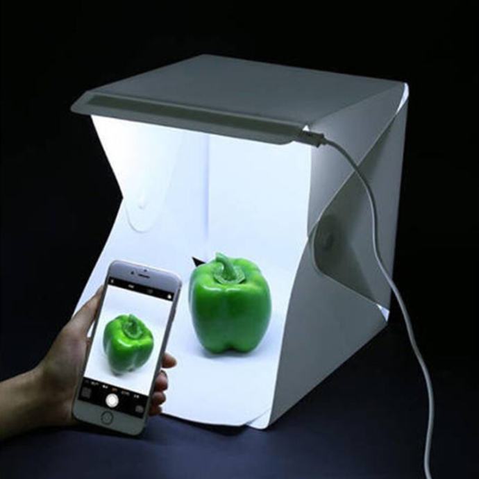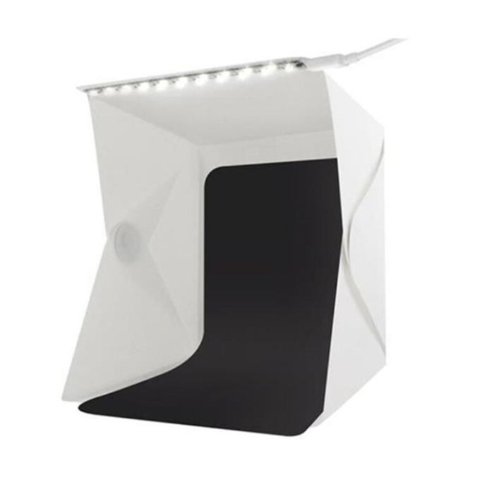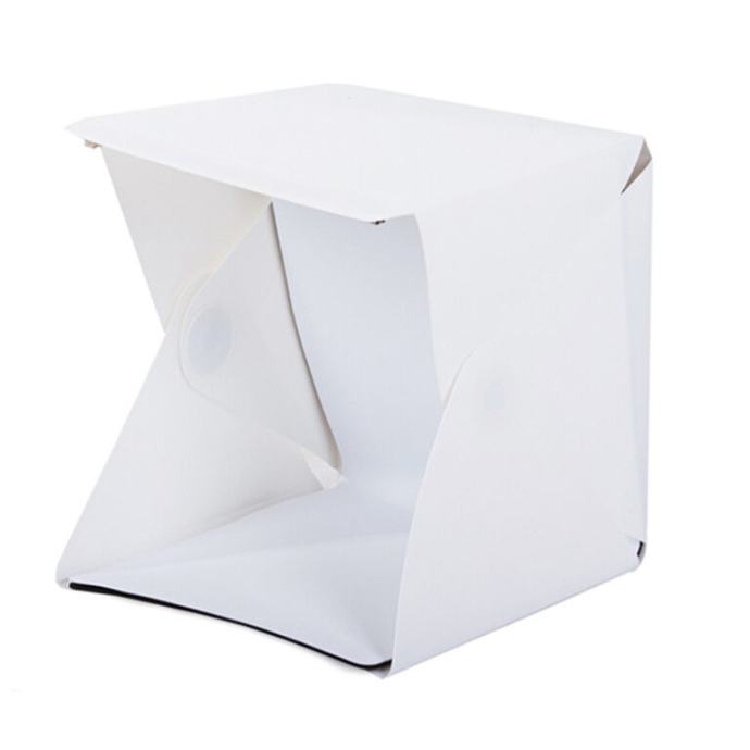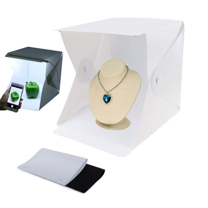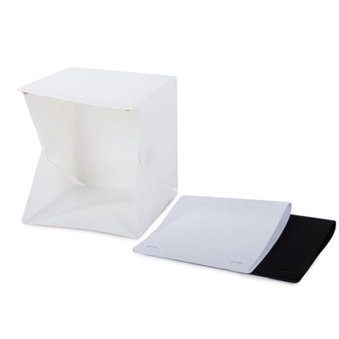 Šator ima vrlo jednostavnu strukturu. Dovoljno ga je raširiti na ravnu podlogu, zatim saviti rubove na linijama i pričvrstiti ugrađenim magnetima. Biramo bilo koju pozadinu: bijelu ili crnu, spajamo USB kabel i možemo fotografirati.