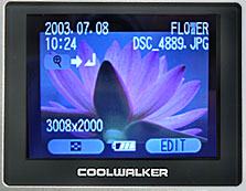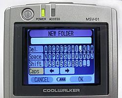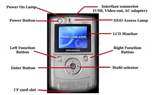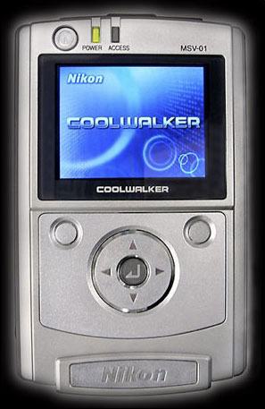 The CoolWalker MSV-01 has a 2.5" TFT LCD monitor (made by Sony), rubberized body finish, a CompactFlash Type I/II slot (other media supported via CF adapters), a Toshiba 30 GB hard disk, Hi-Speed USB 2.0 interface, Audio/Video output plus supplied IR remote control (Nikon ML-CW1), is powered by a Lithium Polymer battery (Nikon EN-EL6) and has PictBridge direct printing support. The CoolWalker MSV-01 measures 130 x 81 x 35 mm (5.1 x 3.2 x 1.4 in) and weighs just 350 g (12.3 oz). The CoolWalker supports JPEG, TIFF and NEF (Nikon RAW from digital cameras) as well as the playback of audio and video clips (Motion JPEG).