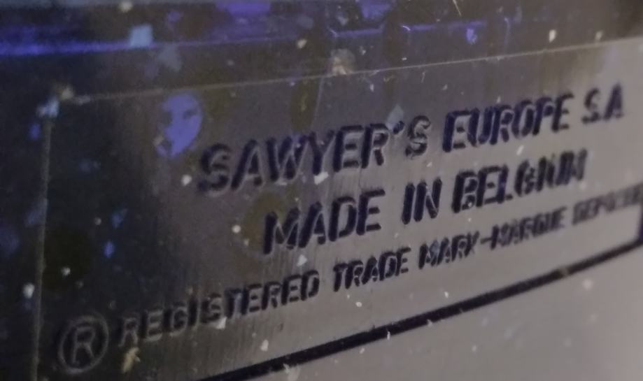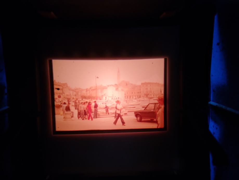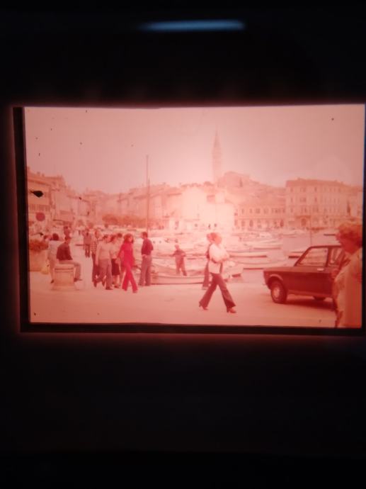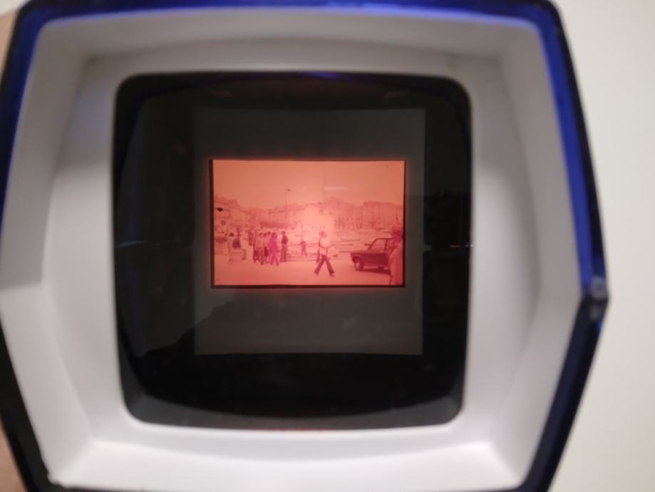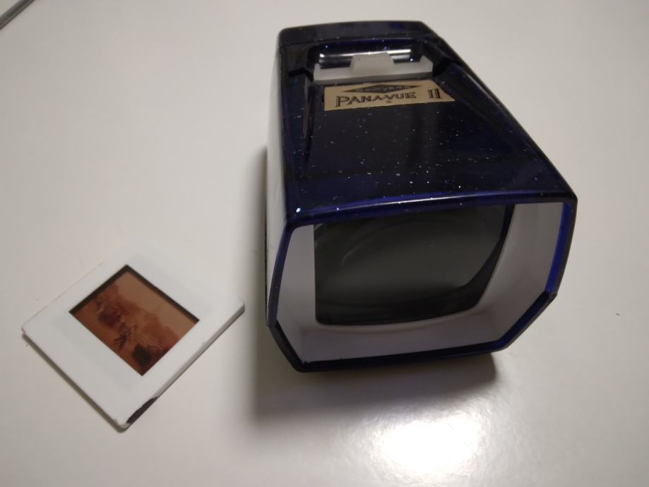 Preglednik dijapozitiva, 1960-ih i 70-ih. Za dijapozitive veličine 5 x 5 cm. Plavo plastično tijelo s obojenim točkicama. Zaslon za pregled s bijelim plastičnim rubom. Utor za dijapozitiv na vrhu, s plastičnom pločicom koja aktivira svjetlo. Gore označeno s "SAWYER'S / PANA-VUE II". Donje označeno s "SAWYER'S EUROPE S.A. MADE IN BELGIUM R REGISTERED TRADE MARK-MARQUE DEPOSEE