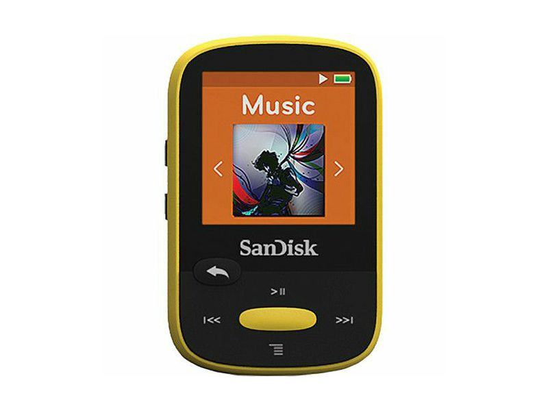 Clip, listen, and hit the gym with the yellow SanDisk 8GB Clip Sport MP3 Player. This lightweight MP3 player features 8GB of flash memory and a microSDHC card slot that supports memory expansion. The player has a convenient clip that's designed to keep the device secure - even if you're working out. Just clip it to your clothing or wristband, and hit the gym or head out for a jog. The Clip Sport is also equipped with a 1.44" color LCD screen that makes it easy to navigate the intuitive user interface. You can quickly choose songs sorted by title, artist, or album.