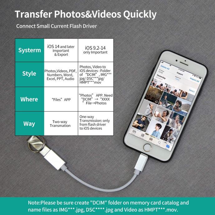 Za korisnike iOS 9.2-12.4, ovaj usb adapter za kameru podržava JPEG i RAW foto format i H.264 i MPEG-4 video format preuzet s digitalnog fotoaparata. Fotografije/videozapise s digitalnog fotoaparata možete uvoziti samo na svoje iOS uređaje. Za korisnike i0S 13 ili novije verzije, dvosmjerni je prijenos, možete uvesti i izvesti slike, video, MP3 datoteke, MP4 datoteke, Excel, Word, PPT, PDF u aplikaciji "Datoteke" ili "Photo".