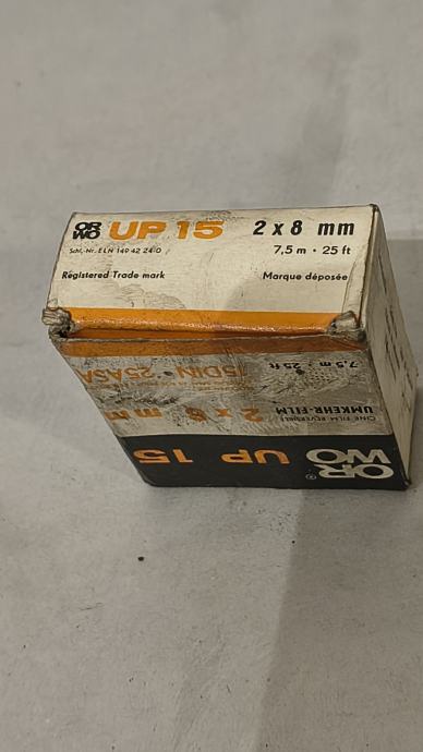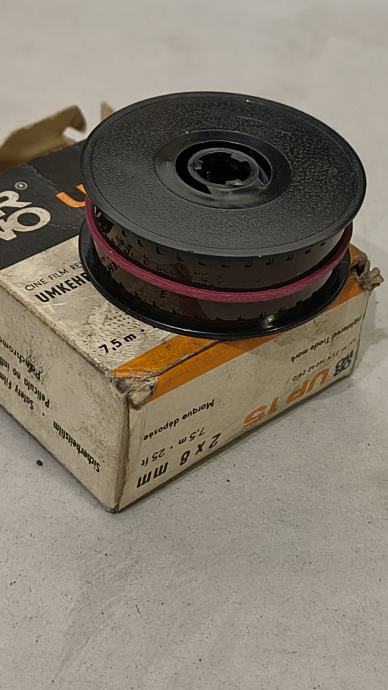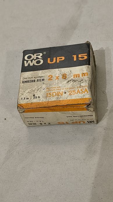 Vintage ORWO UP 15 kino-film (reversal / diapozitivni film), 2 × 8 mm, duljina 2 × 7,5 m (25 ft), osjetljivost 15 DIN / 25 ASA. Dolazi u originalnoj kutiji s metalnom zaštitnom kutijicom i kolutom. Film je istekao (kolekcionarski primjerak), stanje ambalaže vidljivo istrošeno, ali vrlo zanimljivo za kolekcionare, dekor ili ljubitelje analogne i kino-fotografije.