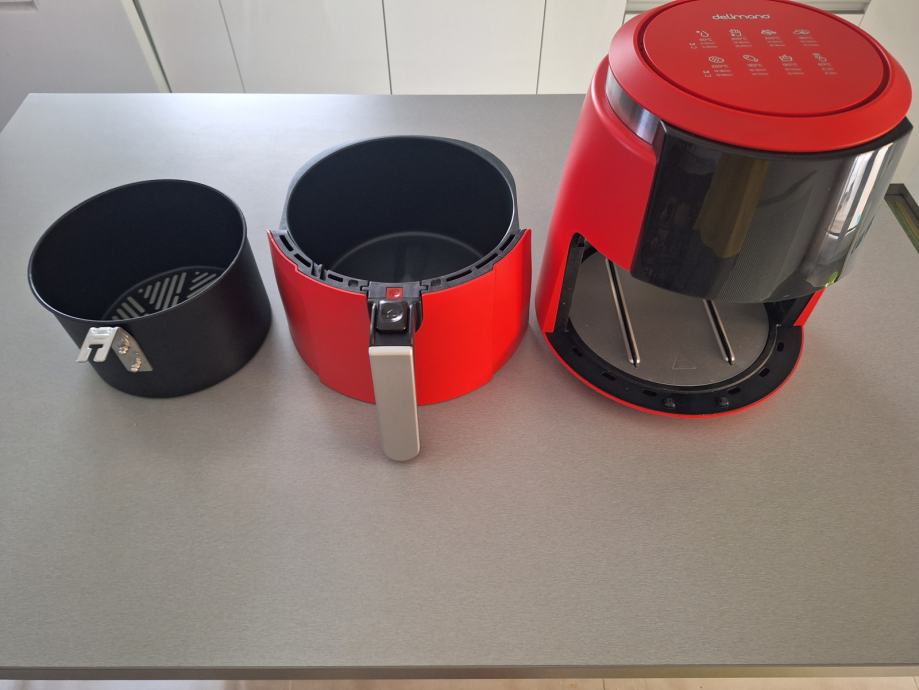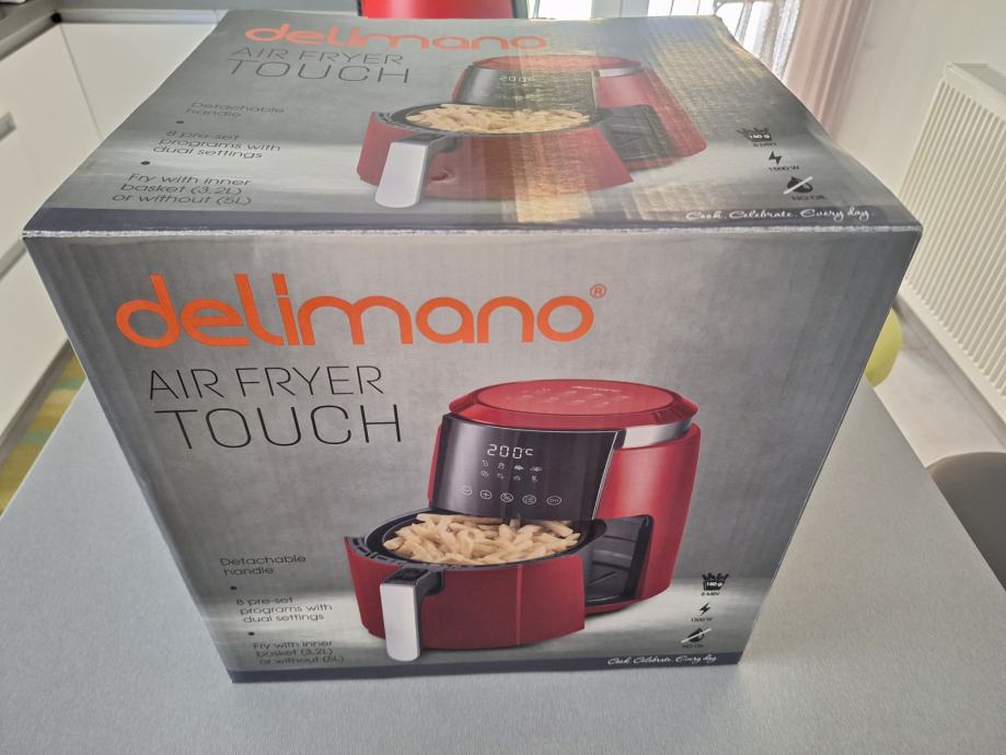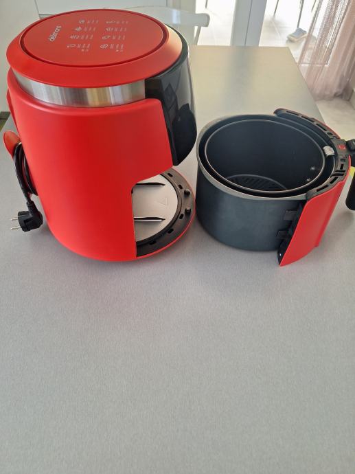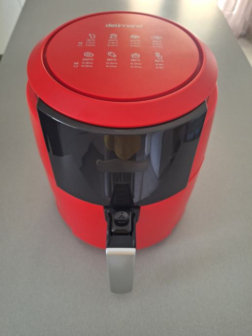 Crvena Delimano friteza na vrući zrak, korištena jednom.1500 W, 8 programa, 2 košare različitih zapremnina (3,2 i 5 L). Originalno pakiranje.
