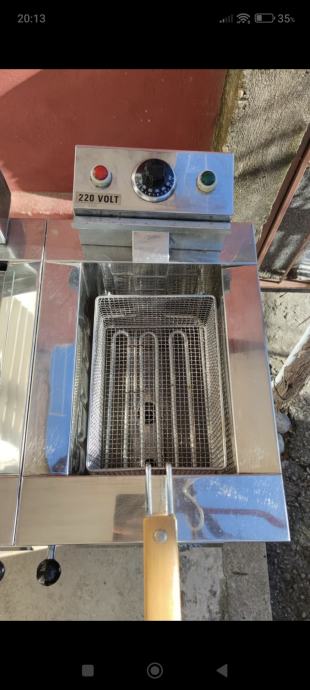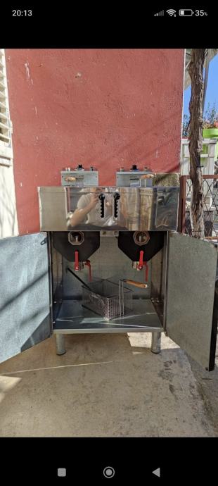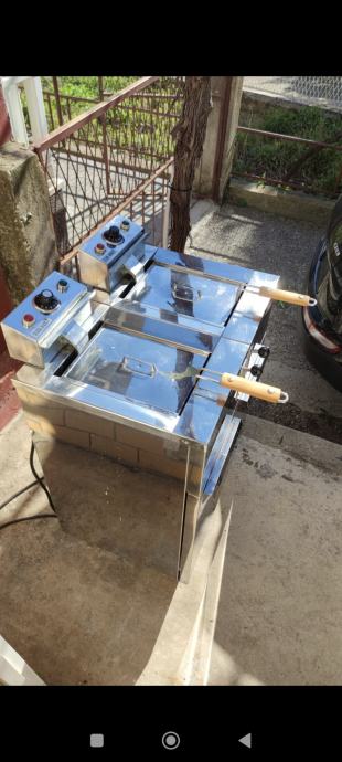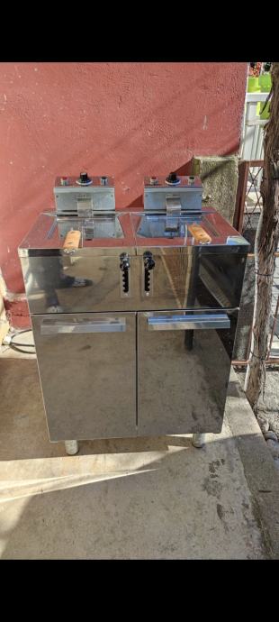 2 x 8l , 2 monofazna prikljucka sa 2 termostata 60-200°C , jedno korito kratko korišteno, drugo nekorišteno. Friteza otad stoji u garaži i ne treba mi. Sa odvodnim slavinama za ispust ulja i trećom košarom.