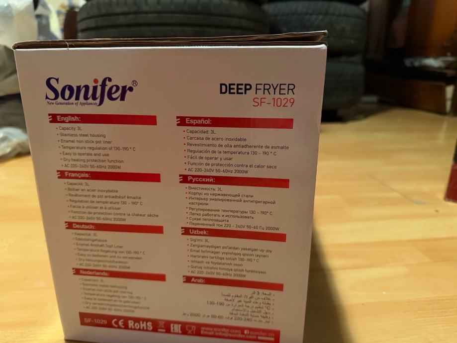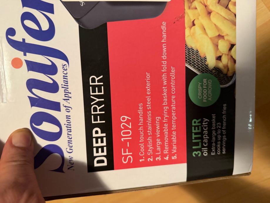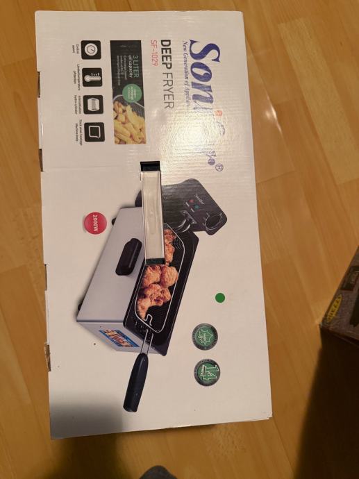 Prodajem rabljenu friteze Sonifer SF-1029. Radi se o modelu s kapacitetom ulja od 3 litre, što je dovoljno za pripremu veće količine hrane odjednom. Ima kućište od nehrđajućeg čelika, hladne ručke, veliki prozor za praćenje prženja, vadljivu košaru s preklopivom ručkom te podesivi termostat. Napon: 220-240V.