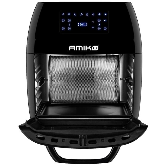 Multifunkcionalna friteza na topli zrak, roštilj, friteza, sušilica za voće i još mnogo toga! Moderna upravljačka ploča sa zaslonom osjetljivim na dodir Višenamjenska friteza s prostranom unutrašnjosti za cijelu obitelj. Uz Amiko A80 fritezu i roštilj na vrući zrak možete pripremiti ukusnu piletinu na žaru, savršenu pizzu, odrezak, ukusne špagete i još mnogo toga na najbolji način - hrskavi izvana, mekani iznutra. Na prednjoj strani friteze nalazi se digitalni zaslon koji pruža odličan pregled, što jamči jednostavno rukovanje uređajem i provjeru trenutnih postavki. Uz Heat2Flov tehnologiju, koja osigurava dinamičan protok vrućeg zraka, hrana pripremljena u fritezi Amiko A80 sadrži do 99% manje masnoće. Friteza nudi ukupno osam unaprijed postavljenih programa na temelju svake vrste sastojka, a okrugli okretni gumb olakšava podešavanje temperature i vremena kuhanja. Uz Amiko A80 Airfrier&Grill možete birati između mnogih dodataka za kuhanje, a uklonjivi dodaci se nakon kuhanja mogu prati i u perilici posuđa.
