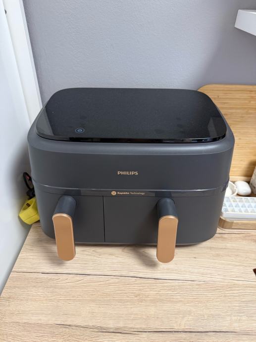 Prodajem Philips fritezu na vrući zrak u odličnom stanju s dva odvojiva spremnika. Modernog je dizajna u sivoj boji s elegantnim drvenim detaljima na ručkama. Idealna za pripremu zdrave hrane bez previše masnoće, jednostavna za čišćenje i korištenje.