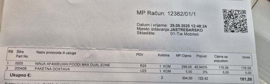 Kupljen 25.09.2025. za 180 €, još uvijek pod garancijom.