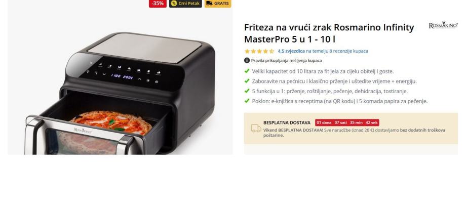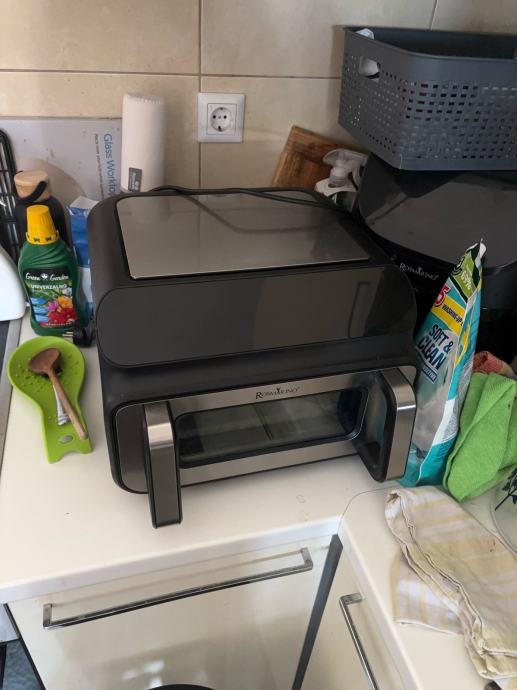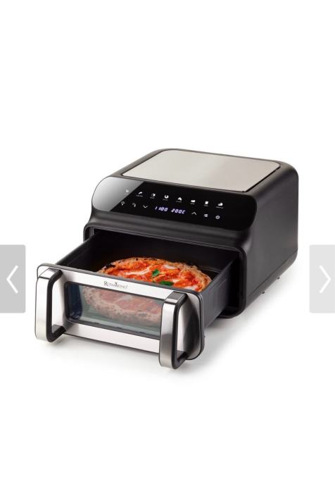 Prodajem rabljenu Rosmarino AirFry fritezu na vrući zrak. Uređaj dolazi s digitalnim upravljačkim panelom na vrhu te pratećim dijelovima s prozirnim staklenim prednjim dijelom kroz koji možete pratiti proces pripreme hrane. Dizajn je u crnoj boji s metalnim detaljima.