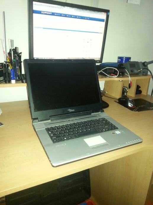Laptopu je neispravan inverter za ekran, uredno daje sliku na ekran kad osvijetli sa baterijem, daje sliku na VGA konektor, instaliran win xp.. Nema nikakvih oštećenja, čak ima foliju na gornjem poklopcu gdje piše Fujitsu-Siemens...