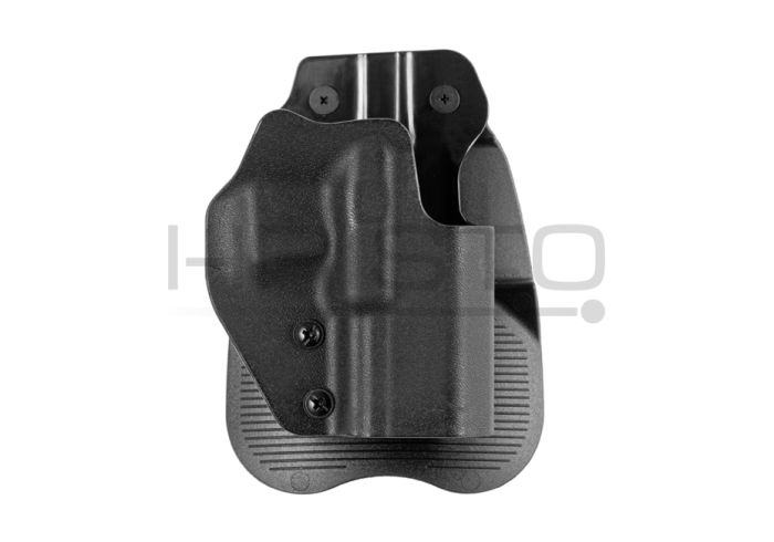 The paddle is connected to the holster by two screws, offering you the option to change the carrying angle according to your needs. Thanks to the 6 holes this paddle offers, you are able to adjust your holster in different cant angles to forward backward - from vertical carrying to cross draw position. With this paddle, your holster is stable and steady: The bottom of the paddle is rugged to keep the holster in place, the two jags hold it on your belt and the "window" enables you to insert your belt via your pants loop into this window while carrying the paddle holster outside your pants. Whether you choose to carry the paddle in your pants or outside u2013 you get the best possible options for carrying your paddle holster.