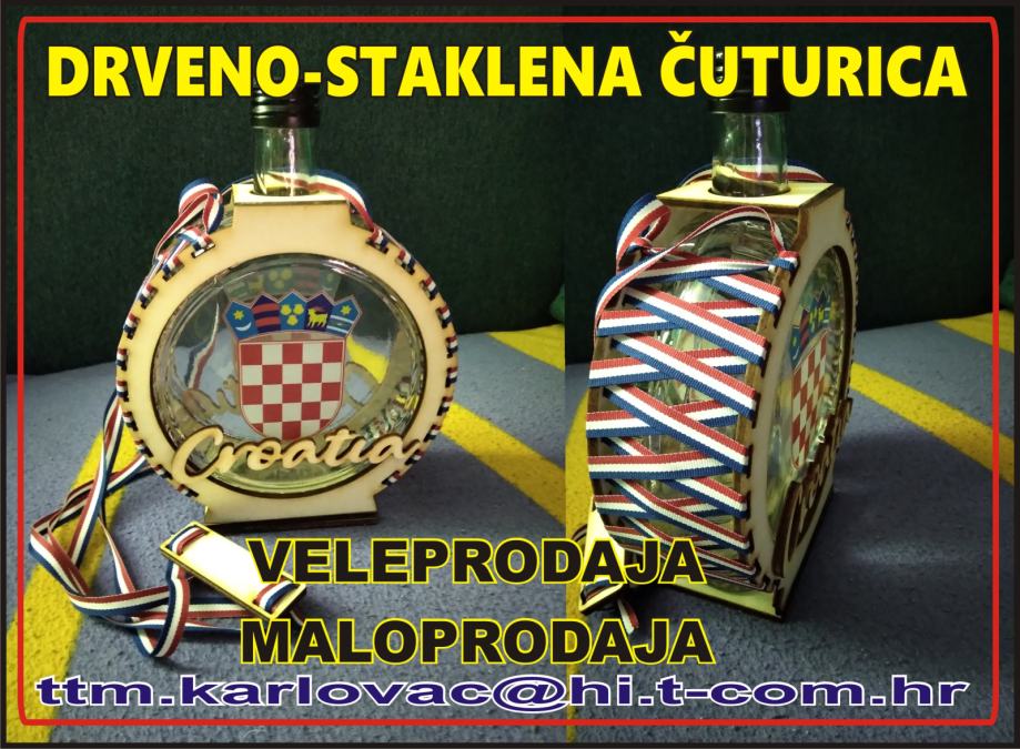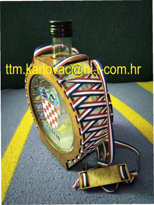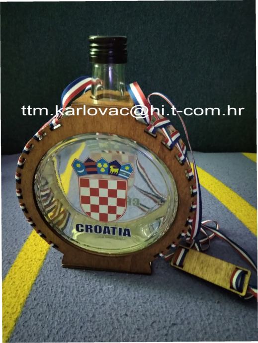 Veleprodaja - Maloprodaja.Novi atraktivni model drveno-staklene čuturice za suvenirnice, gift shopove i sl. trgovine. Staklena čuturica sa drvenim okvirom, opletena trakom trobojnicom koja se produžuje u četiri noseće trake sa drvenim rukohvatom. Tiskani grb na staklu, ispod, sa drvenim reljefnim natpisom Croatia.Model je prozirni tako da se može vidjeti tekućina u čuturici. Drveni okvir se radi u više boja, u dvije verzije tiska na staklu.....Zapremina boce 750 ml, promjer 16 cm, visina 21 cm.