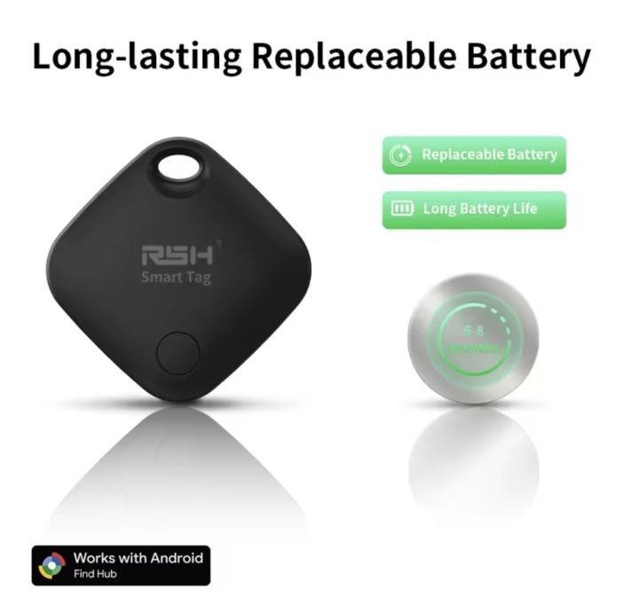 Paket RSH Smart Tag lokator dizajniranih za praćenje vaših izgubljenih ili zaboravljenih predmeta. Ovi pametni tagovi su službeno certificirani od strane Googlea za kvalitetu i pouzdanost te su potpuno integrirani s Googleovom mrežom za pronalaženje.