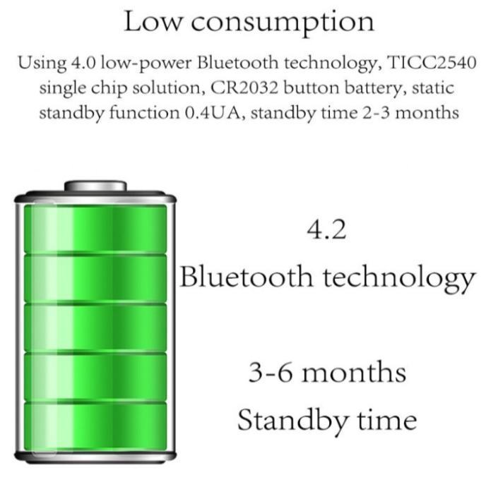 Zahtjevi za Bluetooth: najmanje 4.0. Radi s 1 baterijom CR2032.