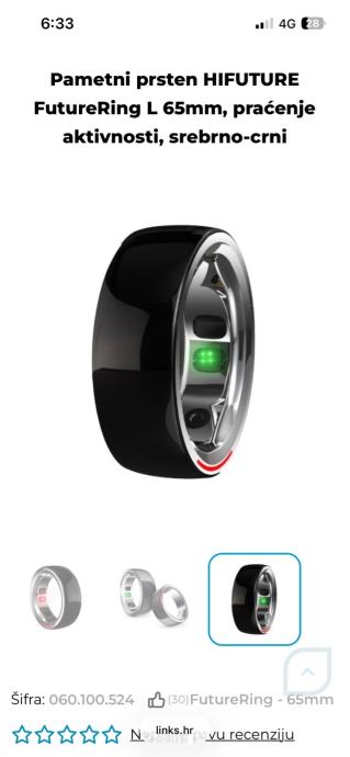 Prodajem nov pametni prsten HIFUTURE FutureRing u veličini L (65mm), srebrno-crne boje. Prsten dolazi s praćenjem aktivnosti i senzorima koji su vidljivi s unutarnje strane.