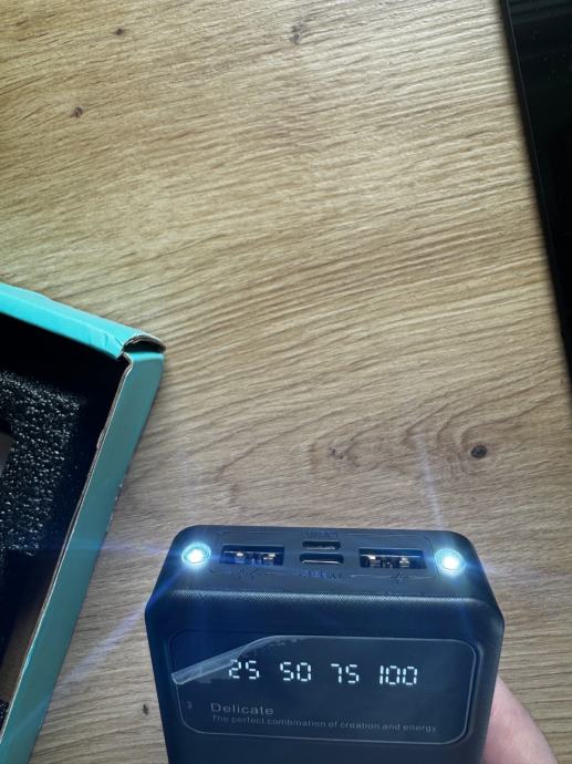 Prodajem novi powerbank kapaciteta 20.000 mAh u crnoj boji. Uređaj ima digitalni LED zaslon koji prikazuje razinu napunjenosti baterije u postocima (25, 50, 75, 100), što omogućuje lak uvid u preostalu energiju.