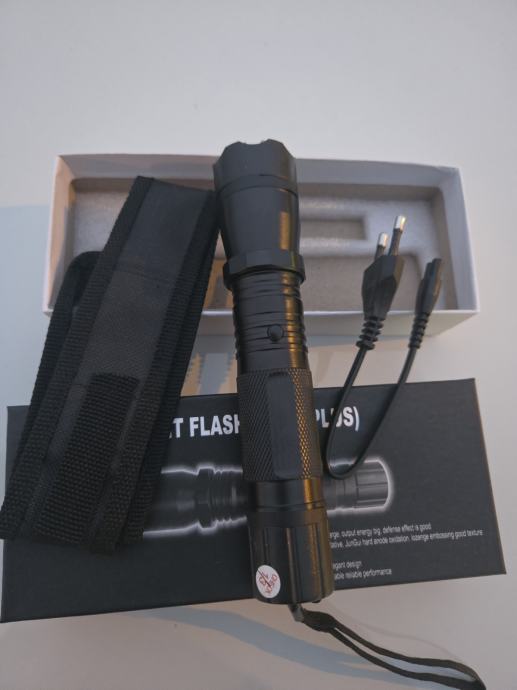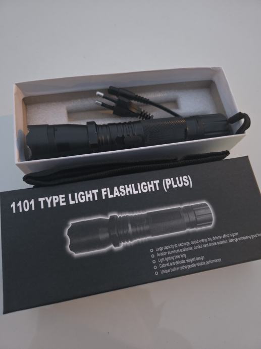 Prodajem višenamjenski uređaj koji kombinira šoker za samoobranu i snažnu lampu. Riječ je o modelu 1101 Type Light Flashlight (Plus), potpuno nov i nekorišten. Uređaj je crne boje s kompaktnim dizajnom, dolazi s remenom za nošenje te kabelom za punjenje. Ima više funkcija uključujući svijetlu LED lampu i elektrošok za zaštitu. U kompletu dolazi sve što vidite - sam uređaj, držač za remen i punjač.