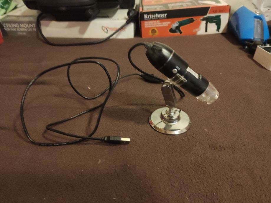 Prodajem rabljeni USB mikroskop crne boje s metalnim postoljem. Spaja se na računalo putem USB kabela koji je priložen uz uređaj. Postolje omogućuje podešavanje kuta glave mikroskopa.