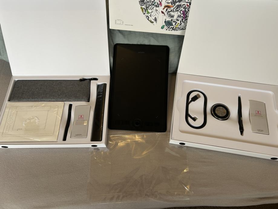 Kompletna originalna ambalaža do zadnje naljepnice i račun. Dvije olovke, svi nibovi (vrhovi) prisutni (jedan u olovci, ostali u držaču olovke), ringovi za olovku, original USB-c kabel. Olovka za crtanje/skiciranje sa/na papiru. Nosač za papir, papir, torbica za nosač papira. Može raditi na usb i bežično (bluetooth). Može se koristiti kao veliki touchpad prstom. Ugrađena punjiva baterija. Radi sa Windows i Mac računalima. Korišten u grafičke potrebe. Sve ispravno i uredno, od olovki, funkcija, dodira, tipki na samom tabletu itd.