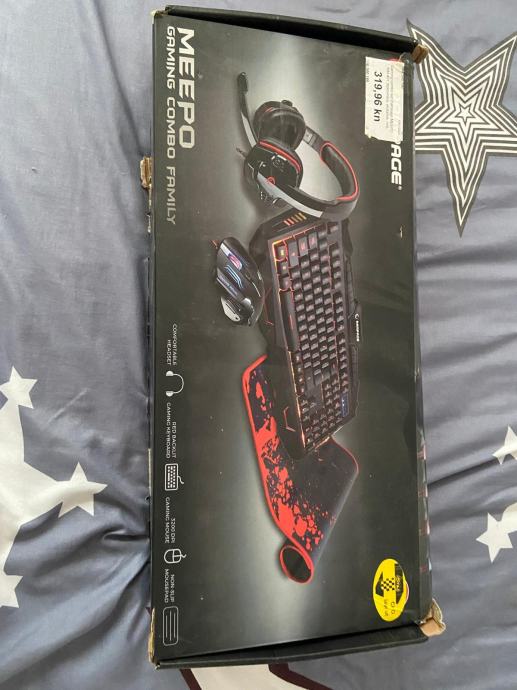 MEEPO GAMING COMBO FAMILY. U paketu dolaze slušalice, tipkovnica, miš i podloga te je na kablove. Ima led svjetla.