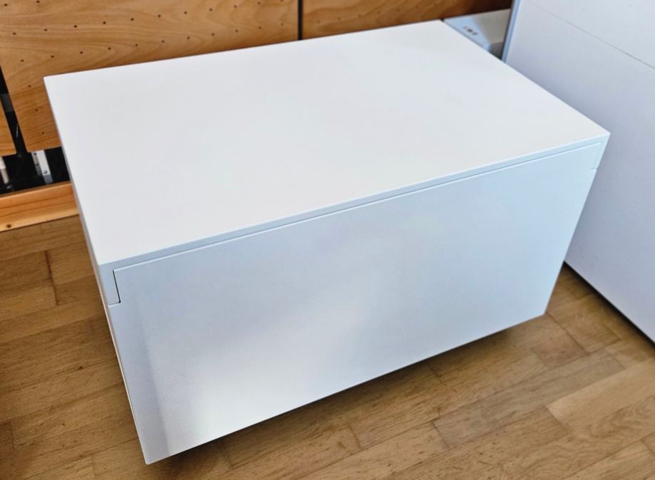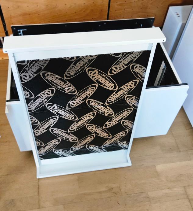 Bijela boja s laganim perleefektom, vrlo prikladna za interijere s bijelim detaljima. WAF (wife acceptance faktor) na razini. Na kotačićima je (s kočnicama) tako da ga je moguće lagano pozicionirati u prostoru. Dodatno dampiran s unutarnje strane kutije samoljepljivom podlogom "Dynamat extreme", jedna od najboljih za ubijanje neželjenih zvučnih vibracija u autoindustriji (zaljepljeno kako u noćnim satima ne bi zvonilo pri manipuliranju). Kada je rig zatvoren odrasla osoba može slobodno stati na njega ili ga iskoristiti kao dodatnu klupu za sjedenje/posluživanje pića&hrane.