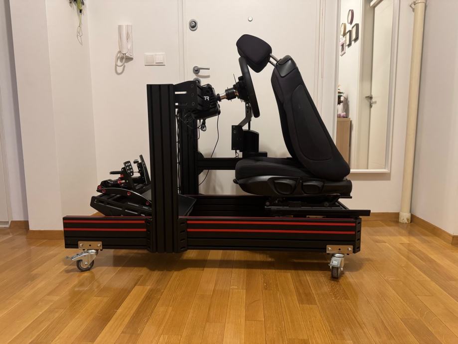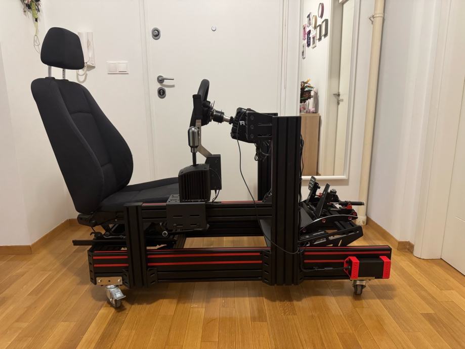 Cijeli rig je složen na custom nosače s industrijskim kotačima s kočnicama za lakše baratanje, a sjedalo je preklopno, na original vodilicama i može se preklopiti za lakše skladištenje.