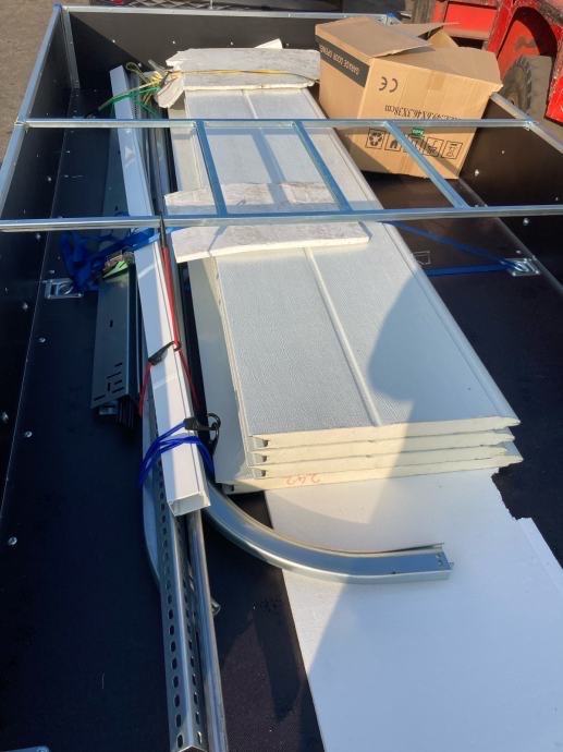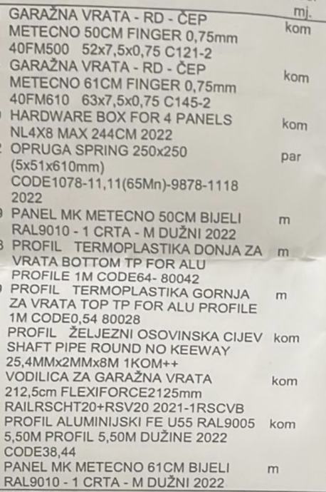 Prodajem nova izrezana četiri obostrana bijela METECNO RAL9010 panela (63cm +3x52cm) s više crta iznutra, a upola manje crta izvana (243x212,5 cm) sa dvije bijele blende (U profilom od 2 kom. x 3m) za početak/završetak panela sa svim okovima, vodilicama, kotačićima, šarkama, bravicom i obostranom plastičnom ručkicom… (vertikalna i horizontalna vodilica) za kompletna sekcijska garažna vrata (niski nadvoj) u što su uključene dvije spring opruge 250x250 (5x51x610mm) sa željeznom osovinskom cijevi od 3m i dva kolotura za obje strane sa niskim nadvojem za postojeći otvor betonskog prolaza (š/v) 240x210 cm.