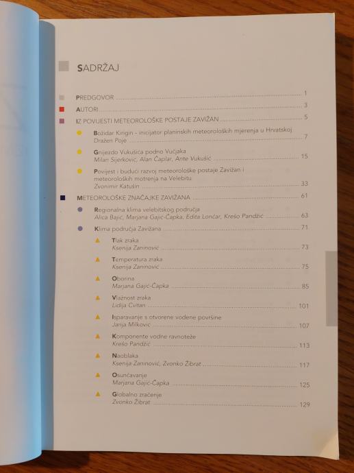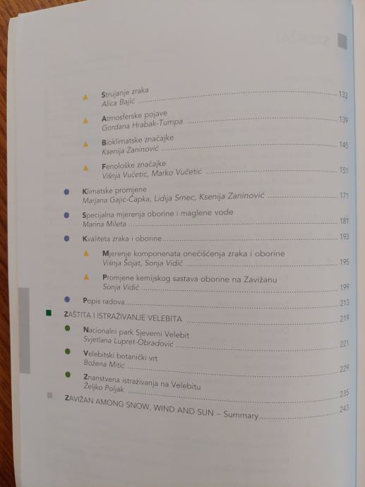 Svatko od nas zasigurno je sebi, netko u ranijoj a netko u kasnijoj dobi, postavio pitanje kako se rađaju meteorološki podaci i kako doznajemo o vremenskim i klimatskim prilikama nekoga kraja. Usmena predaja i pisani opisi meteoroloških događaja, posebice onih izvanrednih, prethodili su instrumentalnim mjerenjima, koja su započela najprije u naseljenim predjelima, ali su neminovno morala doći u planine. Na nepristupačnim mjestima u planinskim krajevima s oštrom klimom nije jednostavno ni postaviti meteorološku postaju, a da bi se još k tome meteorološka mjerenja I motrenja redovito I kontinuirano odvijala, potrebno je mnogo upornosti i ustrajnosti. U Hrvatskoj Velebit je takav nepristupačan kraj. On je razdjelnica između dviju klima, s jadranske strane maritimne, a s ličke kontinentalne, sa svojim planinskim specifičnostima duž obronaka I vršnog područja. Kada je u Hrvatskoj započelo uspostavljanje mreže meteoroloških postaja krajem četrdesetih i početkom pedesetih godina 20. stoljeća, postavljena je i meteorološka postaja na Velebitu. Najviša planinska meteorološka postaja u Hrvatskoj, smještena podno Vučjaka na sjevernom Velebitu, na nadmorskoj visini od 1594 metra radi od 1. listopada 1953. godine bez i jednog dana prekida, unatoč velikim teškoćama kakve su svojstvene takvim planinskim postajama. Rezultat je to zajedničkih težnji meteorološke zajednice za spoznajama o planinskoj klimi, entuzijazma i truda meteorologa, istraživača drugih struka i planinara pri održavanju postaje, te spremnosti meteoroloških motritelja na rad po svim mogućim, ponekad vrlo teškim, vremenskim uvjetima. Zavižanska se postaja mijenjala od čisto meteorološke postaje prema onoj i s ekološkim značajkama programa rada, iako cjelovit meteorološki aspekt nije reduciran, već proširen. Neizmjerno vrijedni zavižanski podaci bili su izazov današnjoj generaciji meteorologa da ih predoče u meteorološkoj monografiji, obilježavajući na taj način 50. obljetnicu rada meteorološke postaje Zavižan. Meteorolozi, djelatnici Državnog hidrometeorološkog zavoda i ujedno članovi Hrvatskog meteorološkog društva, uz nekolicinu suradnika drugih struka, ukupno 22 autora, zdušno su, uz svoje druge obaveze, prionuli pripremi ove monografije. Nastojali su da ona bude zanimljiva i korisna svima onima kojima ti meteorološki podaci olakšavaju odluke u njihovim aktivnostima na području vodoprivrede, energetike, prometa, telekomunikacija, šumarstva, stočarstva, biologije ili prostornog planiranja, kao i brojnim ljubiteljima Velebita – planinarima, izletnicima i turistima. Uvodno nas knjiga upoznaje s inicijatorom planinskih meteoroloških mjerenja u Hrvatskoj i životom meteoroloških motritelja na Zavižanu te pruža pregled povijesti zavižanskih mjerenja. U središnjem dijelu opširan je prikaz klimatskih prilika, bioklimatskih i fenoloških značajki, te značajki onečišćenja zraka i oboirne. Slijede tekstovi o Nacionalnom parku Sjeverni Velebit, na čijem se području nalazi meteorološka postaja “Zavižan”, o Velebitskom botaničkom vrtu u kojem je proveden niz mikrometeoroloških mjerenja, te pregled znanstvenih istraživanja na Velebitu čiji su se sudionici neminovno osvrtali i na meteorološke prilike tog kraja. Popis radova u kojima se koriste zavižanski meteorološki podaci daje detaljniji uvid u 50 godina istraživanja na području klimatologije, ekologije, šumarstva i drugih djelatnosti u kojima je prisutan neposredan utjecaj planinskih meteoroloških prilika. Vjerujemo da će za bolje snalaženje u knjizi, koja može poslužiti poput vodiča ili priručnika, uvelike pomoći uvodna likovna rješenja uz svako poglavlje, popraćena kolažima likovnog umjetnika inspiriranog meteorologijom. Brojni grafikoni i tablice stručno su komentirani u tekstu, ali ostavljaju i mogućnost čitatelju da sam očita neki podatak koji ga posebice interesira, kao npr. prosječnu dnevnu temperaturu pojedinog dana u godini, trajanje snježnog pokrivača određene visine, ili prosječne datume nastupa pojedinih razvojnih faza promatranog bilja. Fotografije, čiji su autori stručnjaci različitih profila i osobe različita interesa ─ meteorolozi, biolozi, planinari ─ iz svojeg kuta približuju meteorološke instrumente i pojave, surovost i ljepotu zavižanskih snježnih zima, ljupkost velebitskog cvijeća i gordost njegovih stijena.