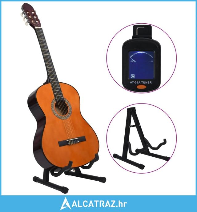 Naša klasična gitara odličan je instrument za početnike, amatere i glazbenike bilo koje razine. Uz gitaru, set dolazi s futrolom za gitaru, remenom, trzalicama, držačem za trzalice, kompletom gitarskih žica, ručicom za žice, kapodasterom, kromatskim podešivačem i držačem za gitaru.