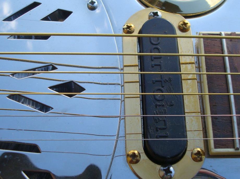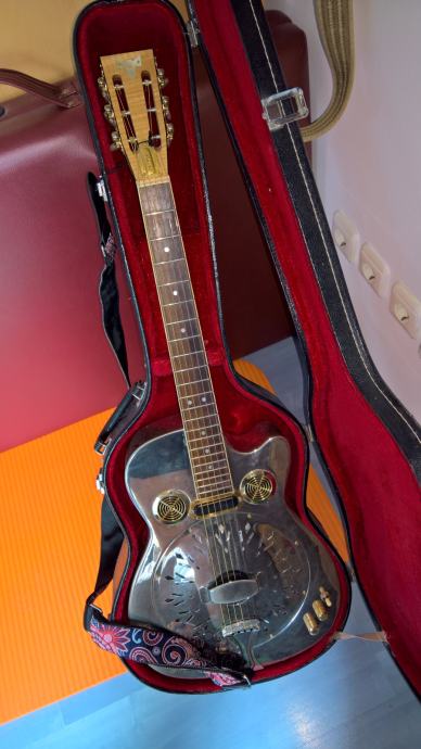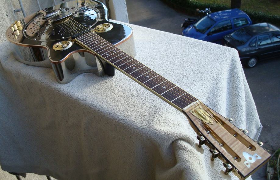 Resonator gitara, biscuit bridge on alu cone, Bartolini pick up i na cone nasađen transducer.