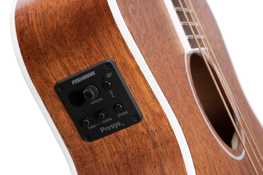 Cort AB590MF OP WBA elektoakustična bas gitara. Torba UKLJUČENA. Koncertno tijelo, bočne strane i zadnja ploča od mahagonija, top i vrat mahagonij, a gitara je opremljena Fishman® Presys II elektronikom, pa se može koristiti za manje akustične svirke.