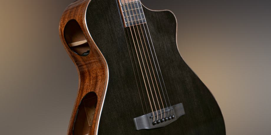 Instead of a soundhole in the top, the innovative design of the Modern Black incorporates dual side-positioned sound ports. With the sound directed towards your ears, you’ll be able to hear every nuance of your technique, even when playing softly. Not only do these non-traditional soundholes make a bold visual statement, they allow the European spruce top to vibrate more naturally for richer acoustic tone. And your audience with be rewarded with balanced, room-filling acoustic tone, whether they’re sitting in front of you or off to the side.