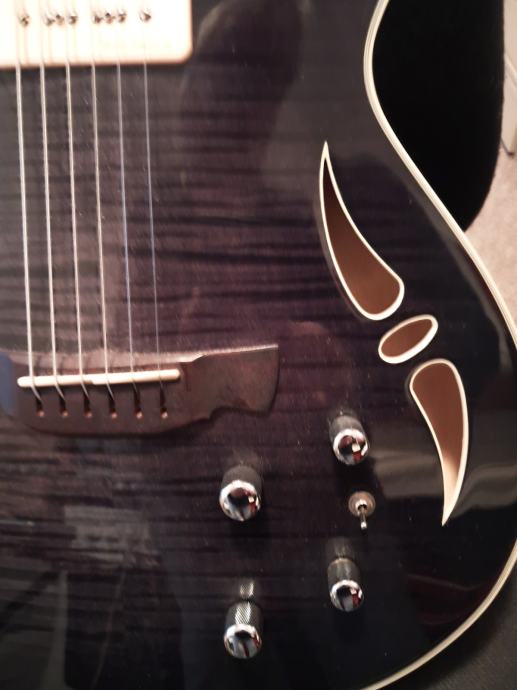 SAT-TMVS is a semi-acoustic guitar from Crafter's Slim Arch Series and is characterised by a thin hollow-body and arched maple top. Thanks to its two S-shaped sound holes, this guitar can be played acoustically and electrically. The Crafter SAT is equipped with a P90 pickup as well as an active Piëzo system for an unlimited assortment of sounds from dirty distortion to easy acoustic strumming.