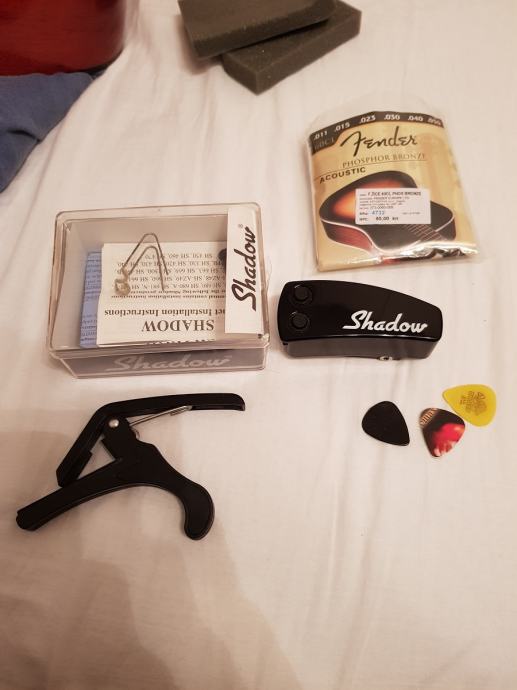 Uz gitaru ide, kapodaster, trzalice, SHADOW pickup koji se može staviti na gitaru te paket novih žica.