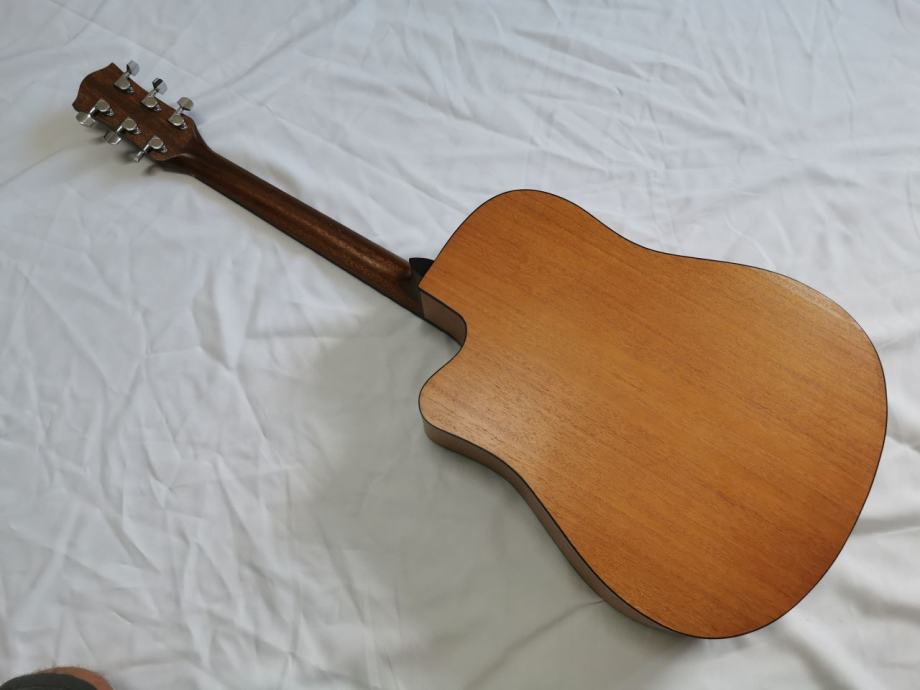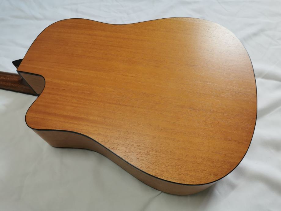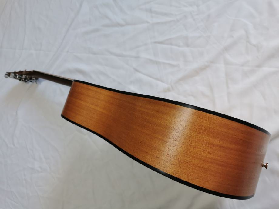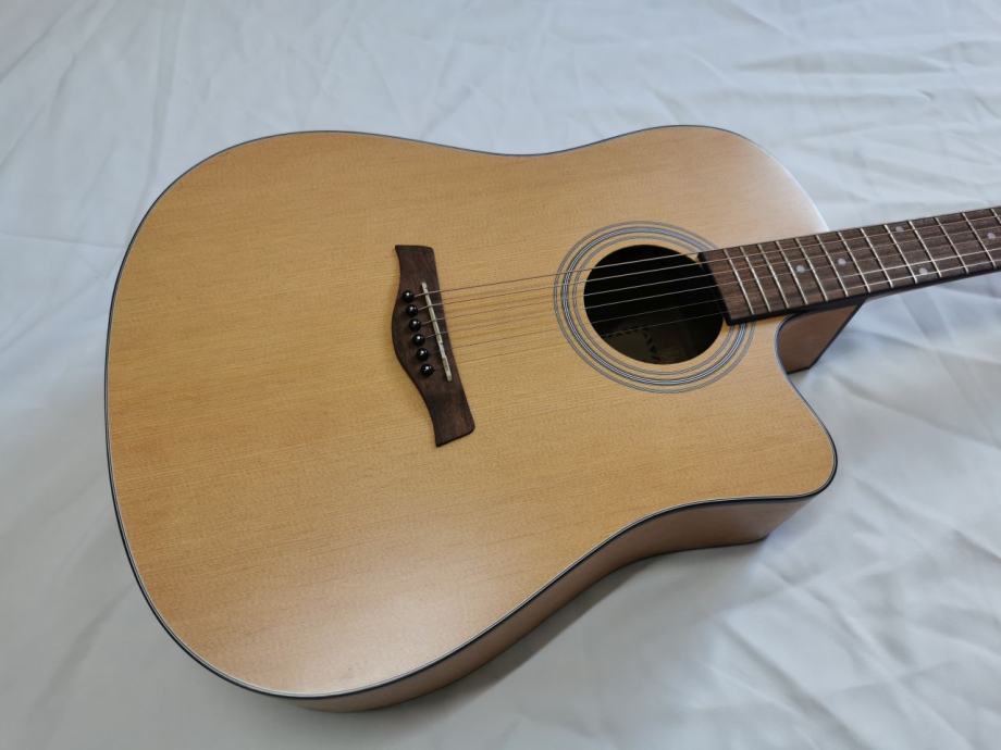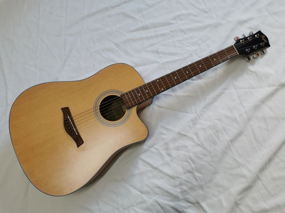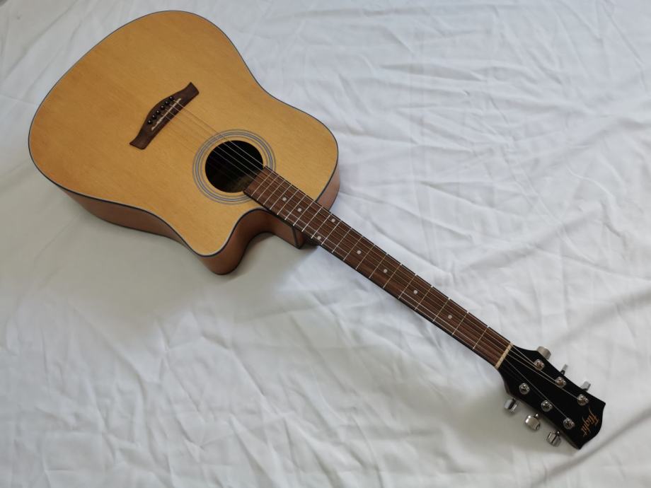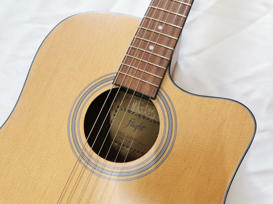 Flight D-155, akustična gitara dreadnaught oblika sa cutwayeom, koji Vam omogućuje da s lakoćom svirate na višim poljima. Vrat gitare je ugodno dizajniran i omogućuje početnicima da s lakoćom savladaju svoje prve akorde! Prednja ploča je izrađena od smreke, što čini zvuk zvonke i prodorne glasnoće. Tijelo gitare je od sapelea.