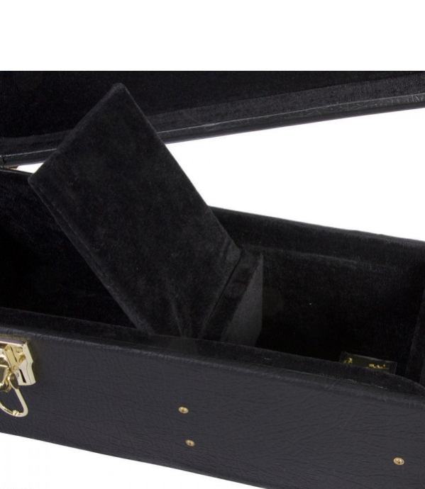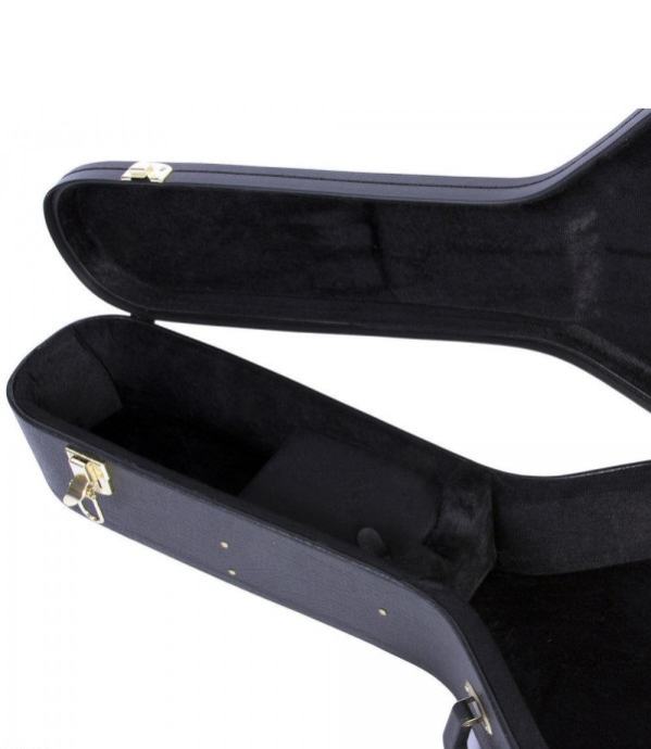 FLIGHT GCA5000B-S je čvrsti kofer za akustičnu gitaru dimenzija 114 x 43 x 15 cm, prikladan za većinu standardnih 6-žičanih ili 12-žičanih akustičnih gitara, plišane unutrašnjosti s pretincem za dodatni pribor, pozlaćenim kopčama i čvrstom ručkom za nošenje.