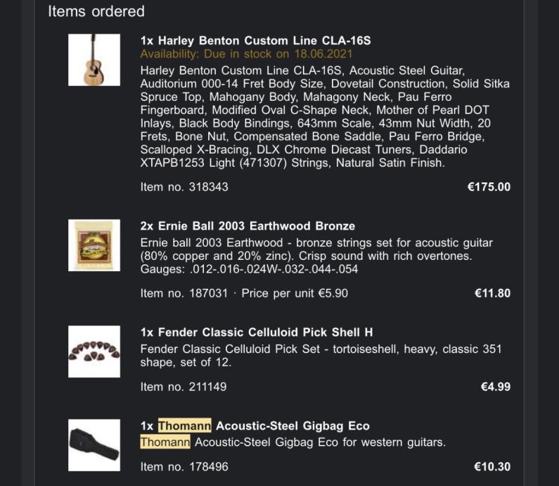 Gitara i dodaci kupljeni su 2021. godine, nikad nisu korišteni, vrijednost na službenim stranicama je trenutno veća nego u vrijeme prve kupovine, a tadašnja cijena je vidljiva na fotografiji 2.