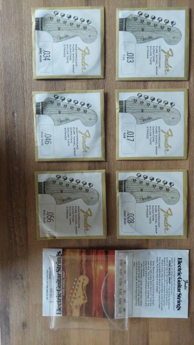 Uz gitaru idu i žice "Fender F-10 SET Regular" (Made in U.S.A.) iz 1970e godine i sve žice su na broju u originalnom paketu.
