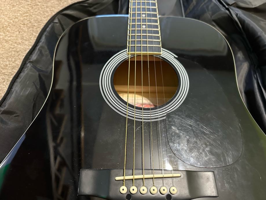 Gitara korištena 3 mjeseca, 1 žica zamijenjena jer je pukla. Gitaru prodajem s futrolom.