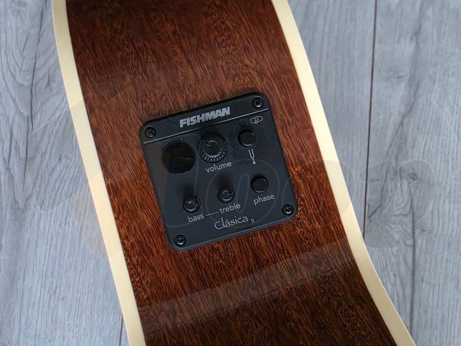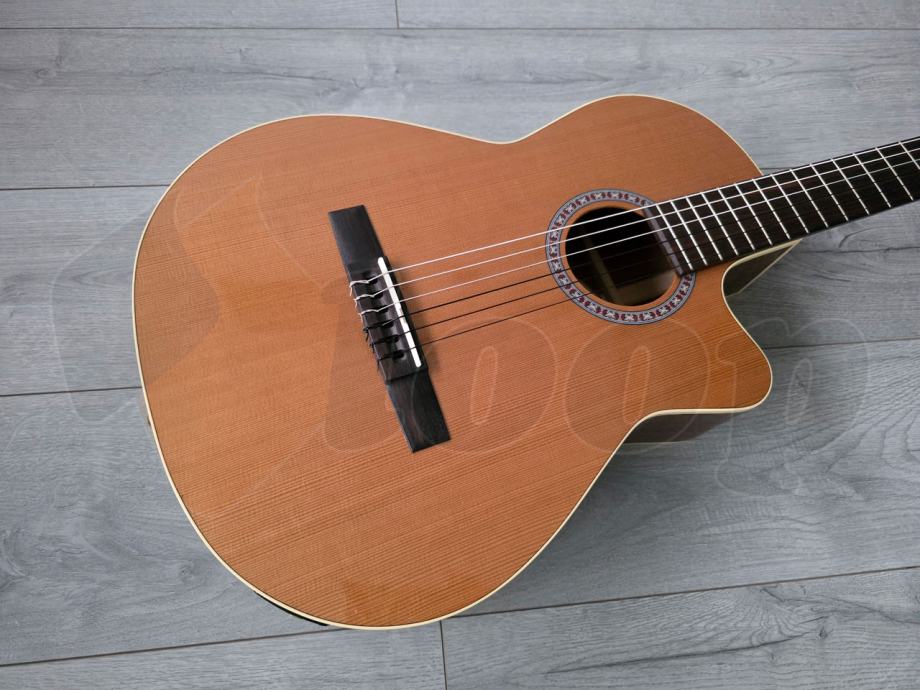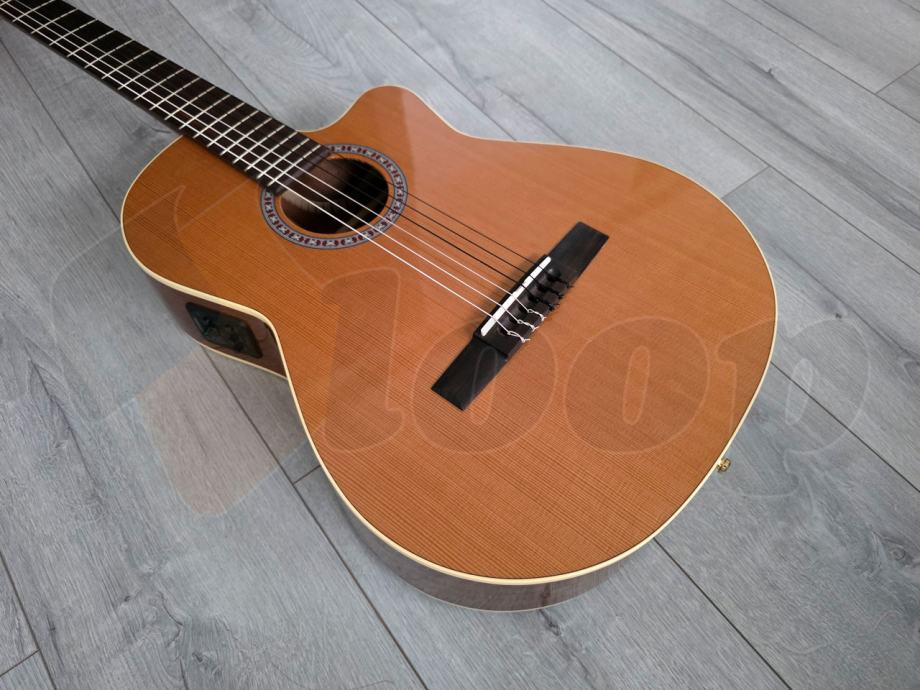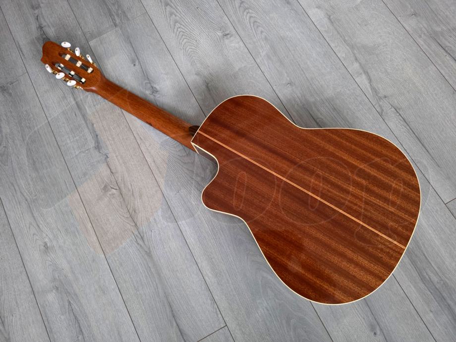 iznimno očuvana ozvučena klasična gitara s tankim tijelom i punim mahagonijem na leđima i bočnim stranicama, namijenjena za koncertnu upotrebu i studijsko snimanje. Gornja ploča izrađena je od punog cedra, s završnicom visokog sjaja koja je ručno polirana za maksimalnu odzivnost. Prstohvat od palisandera ima radijus od 24" i 19 pragova, a vrat je opremljen dvostrukom podesivom truss šipkom za preciznu prilagodbu. Cutaway dizajn omogućuje lakši pristup višim pozicijama, dok ugrađeno pretpojačalo s kontrolama glasnoće i tona osigurava jasan i prirodan zvuk. Mašinice za uštimavanje s omjerom 14:1 pružaju stabilnost, a ukupna konstrukcija nudi izražajnost i pouzdanost za profesionalne gitariste. - "Made in Canada".